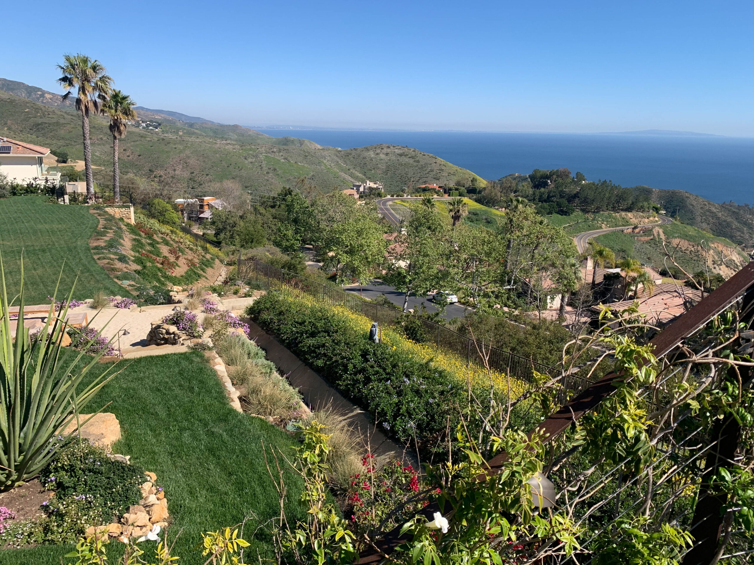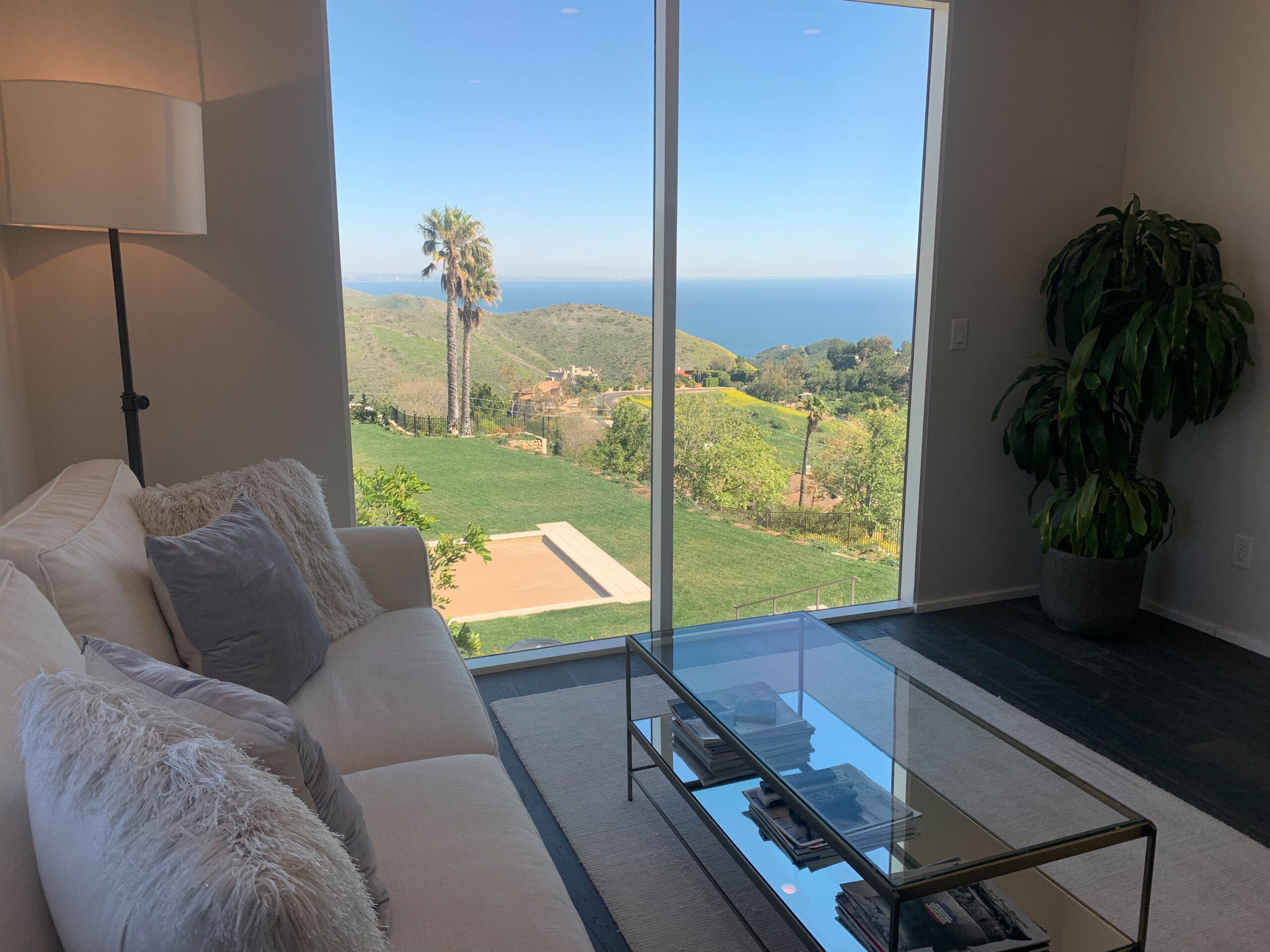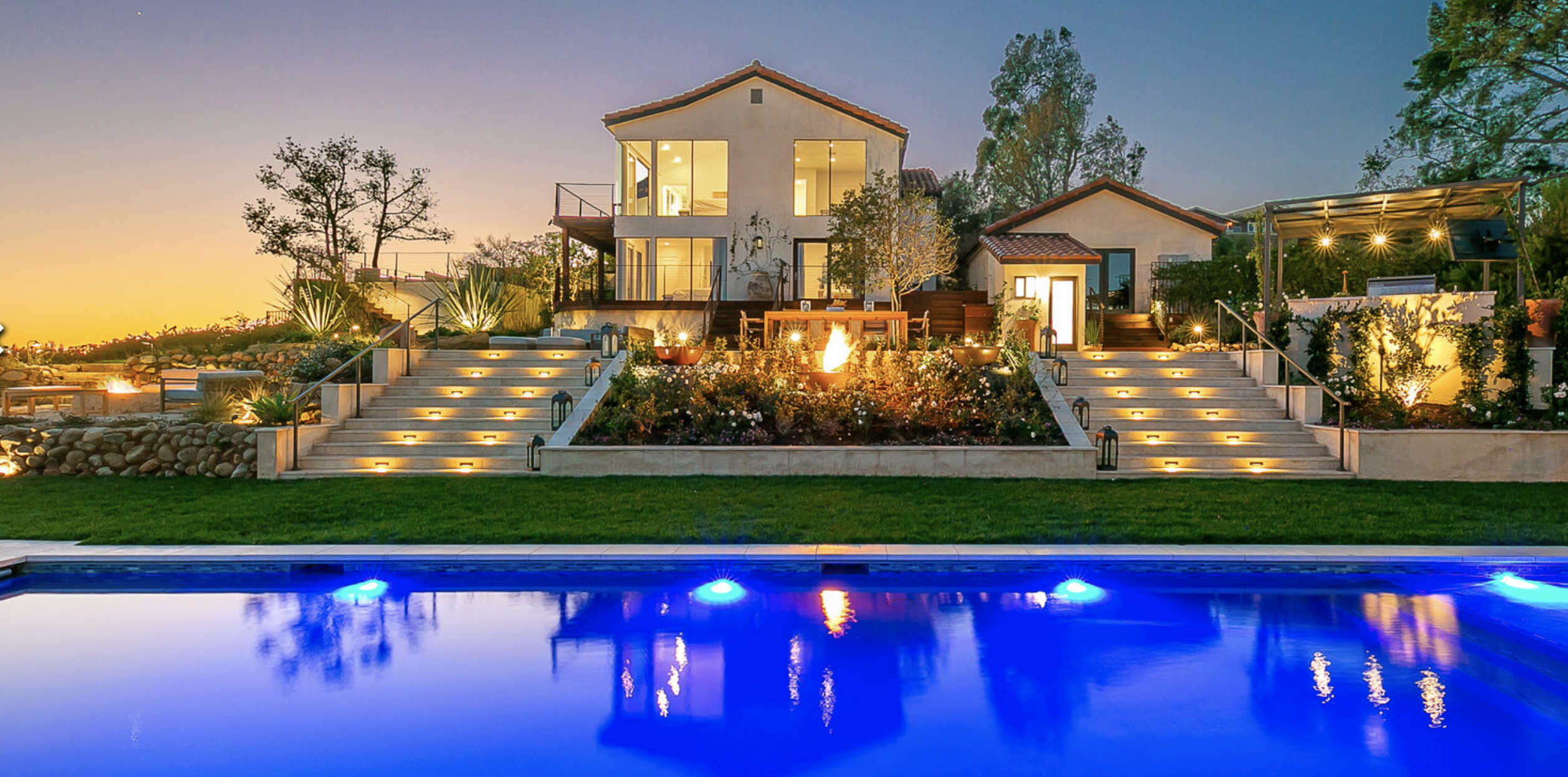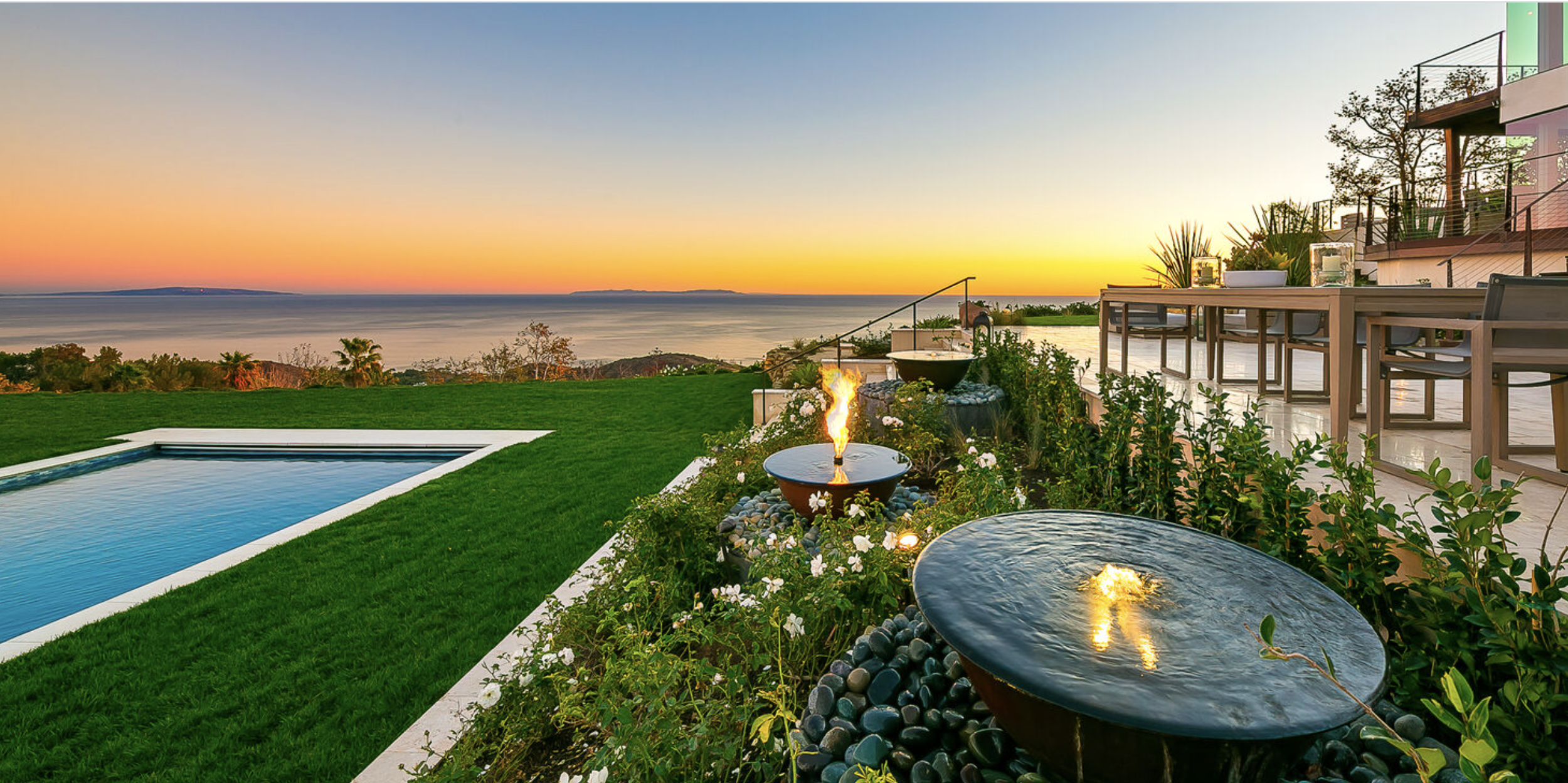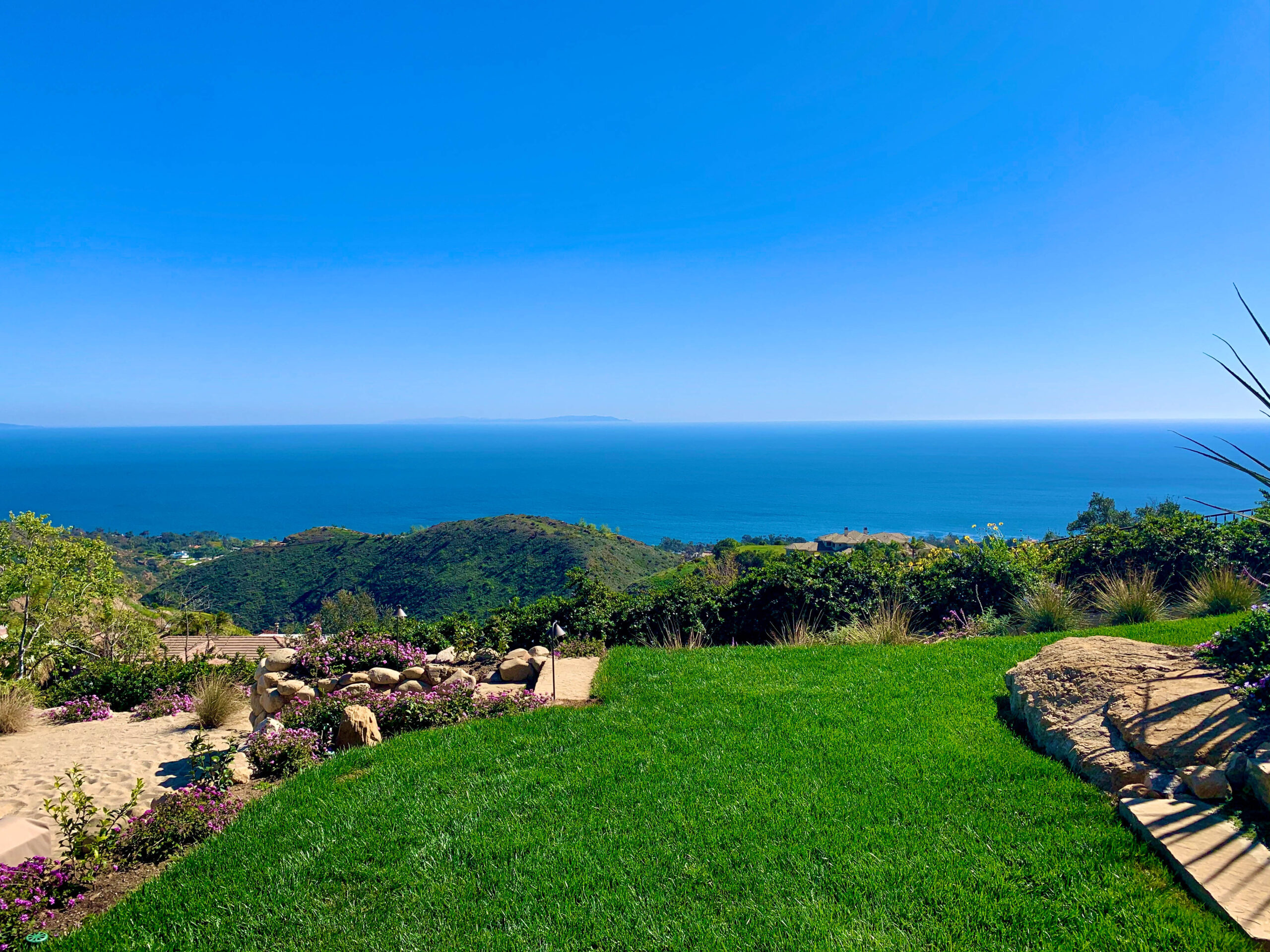 Enjoy magnificent ocean views from this 4 bedroom, 3 bath Spanish Modern pool home. With a flowing floor plan, this home is prefect for entertaining. Home has open great room plus a separate family room and den for quieter moments. Set on a flat acre lot with fruit trees, raised flower beds, meandering pathways and magical lighting, this property is a must for romantics and families alike. Ocean and pool views from almost every room are a delight. Grounds contain a huge grassy lawn, fire pits, fountains, ” beach area” and an outdoor bar with TV. High end kitchen and baths complete the Lux feel of this property.