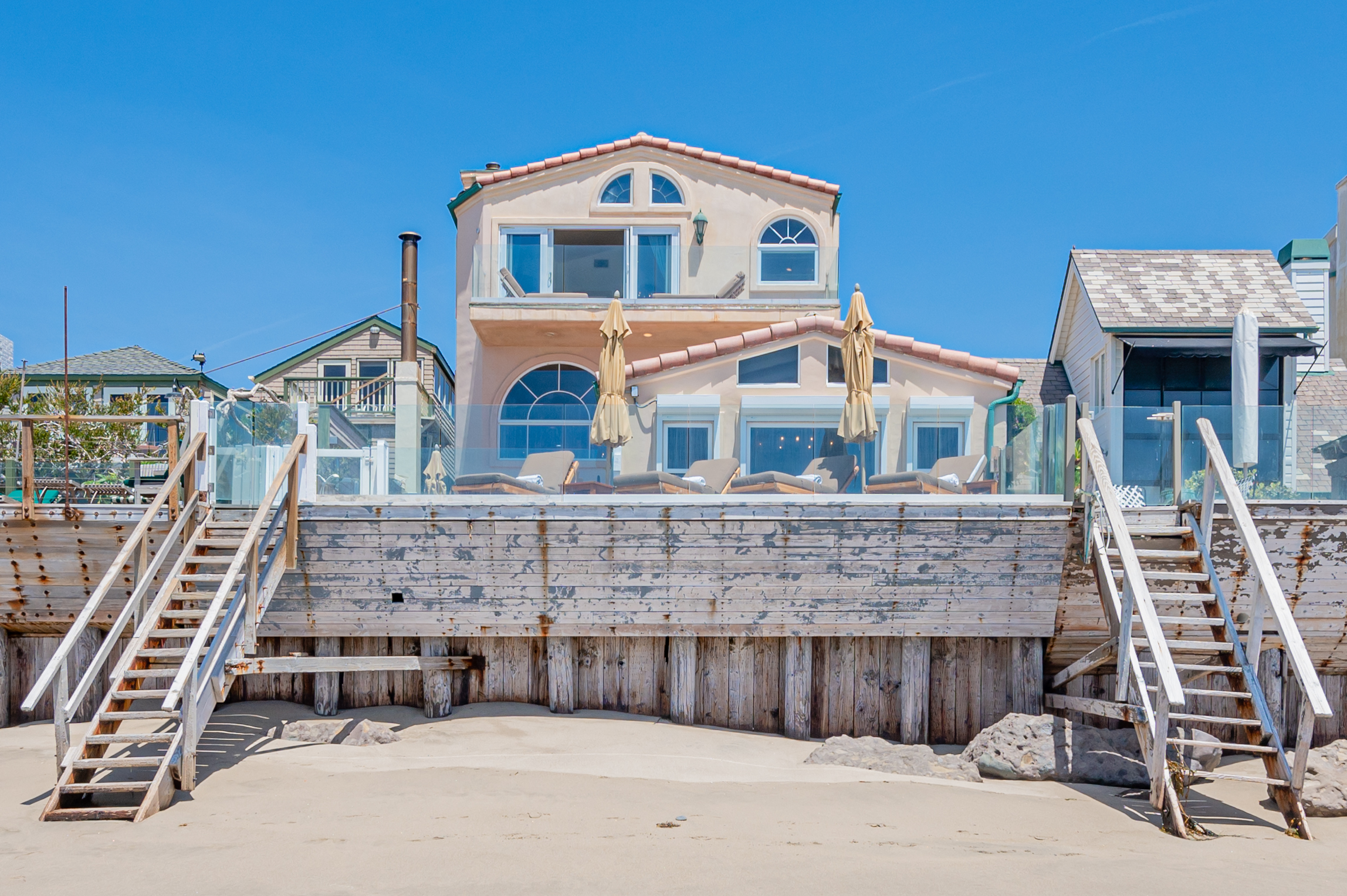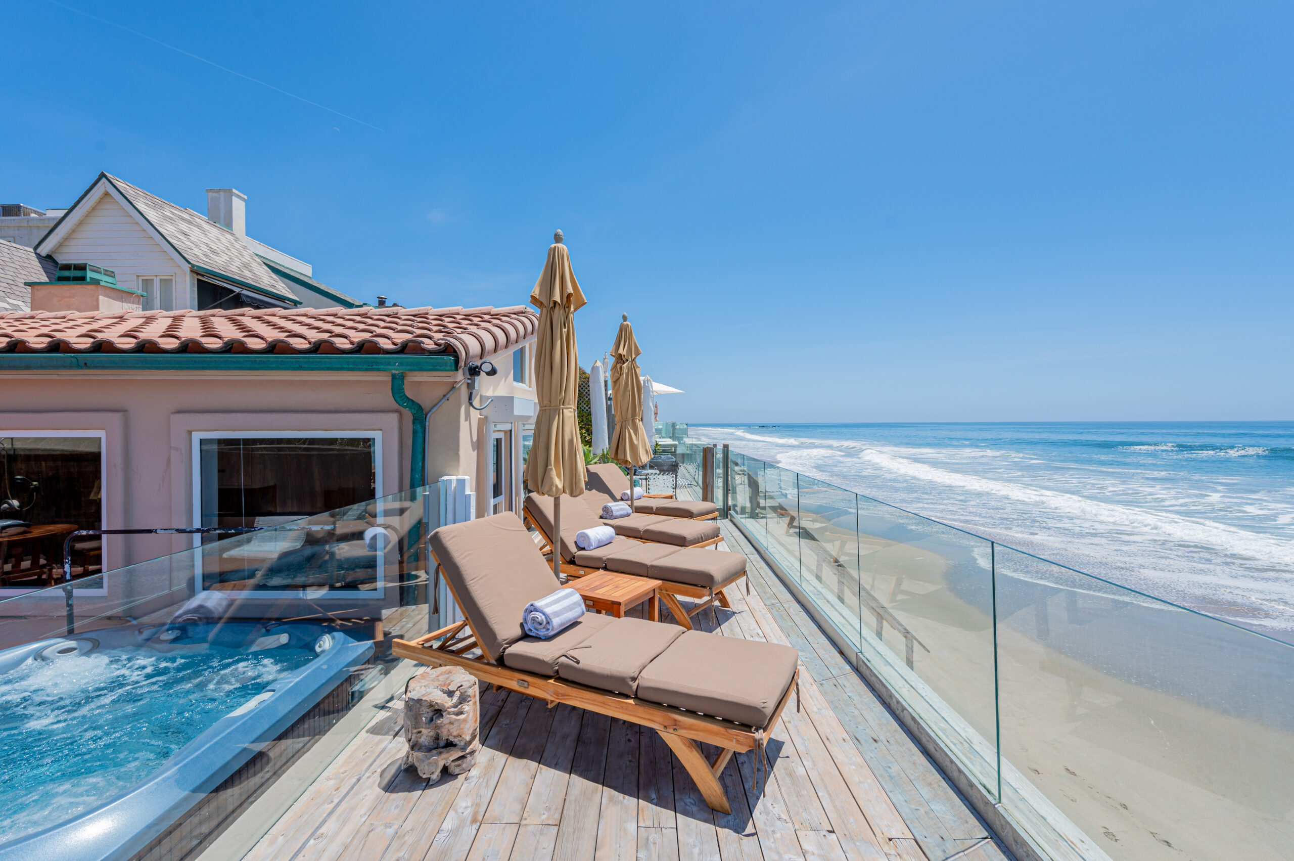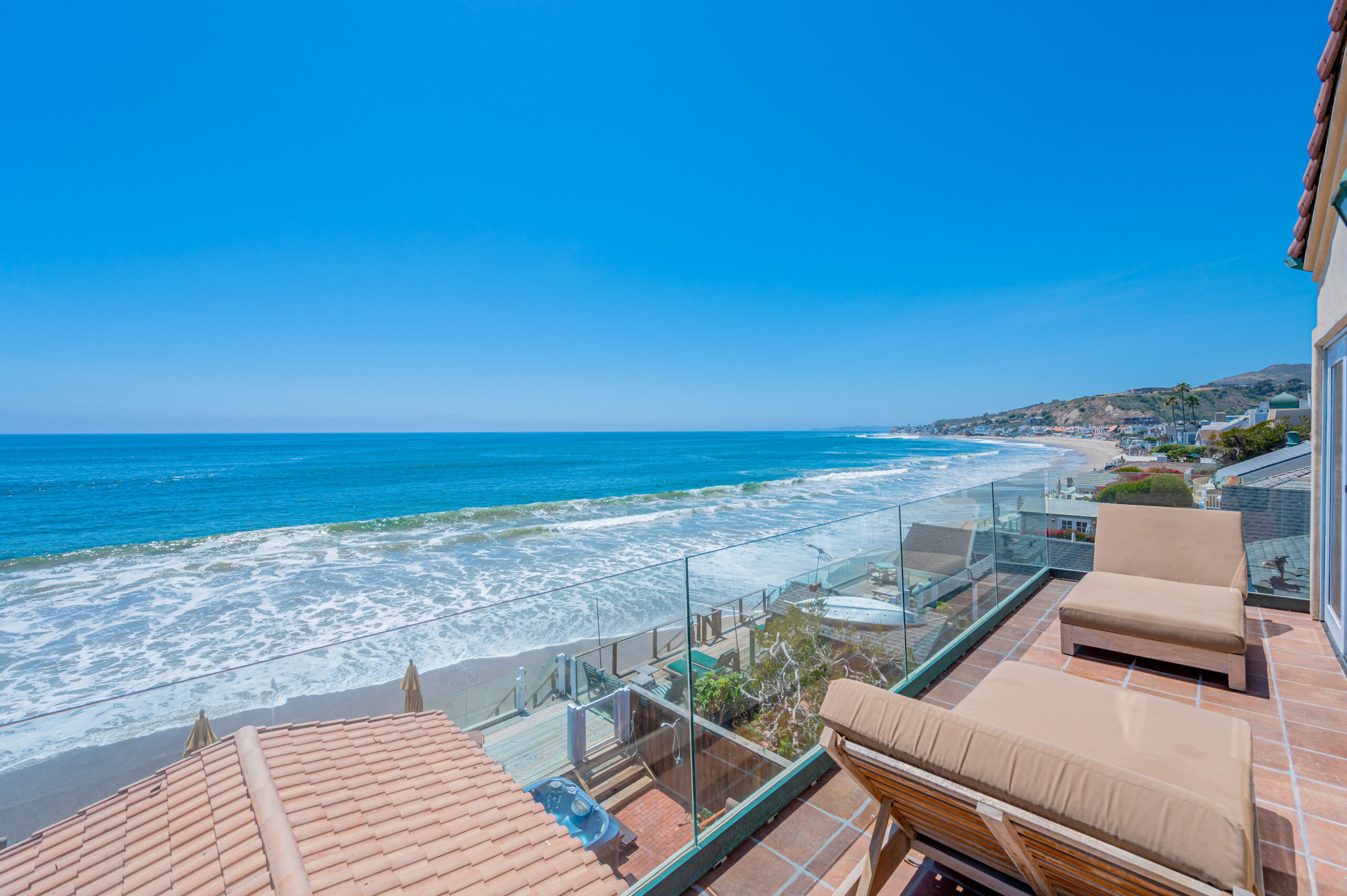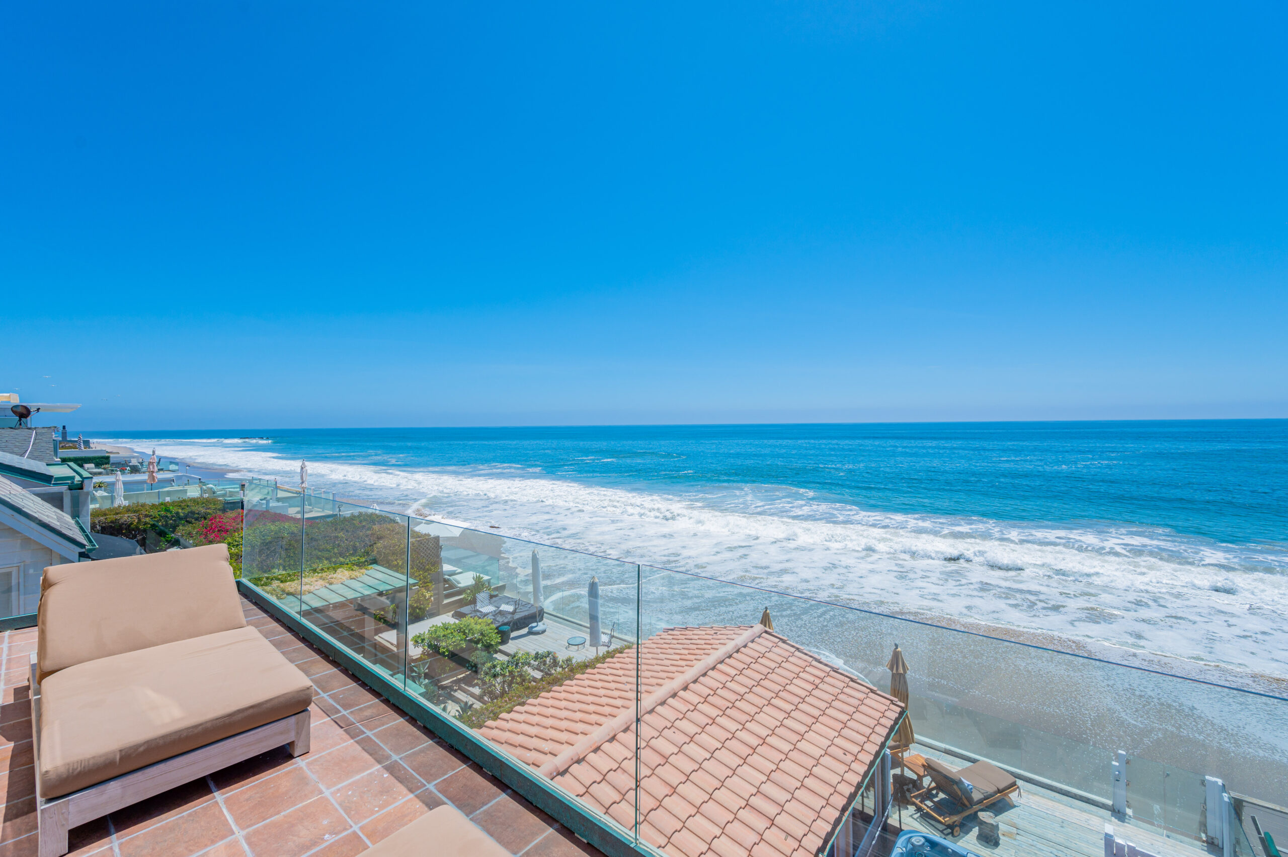 Inside the gates of the Malibu Colony, Contemporary Mediterranean ocean front paradise. This elegant and inviting home boast high ceilings, a gourmet kitchen and an open floor plan. The living room and magical tea room lead out to a large beach front patio with ocean view spa and outside dining area perfect for entertaining with friends. On the mezzanine level a pool table and bar. Master suite with a private balcony, ocean view spa and steam shower. Huge separate guesthouse with high ceilings, living room, one bedroom and one bath.
