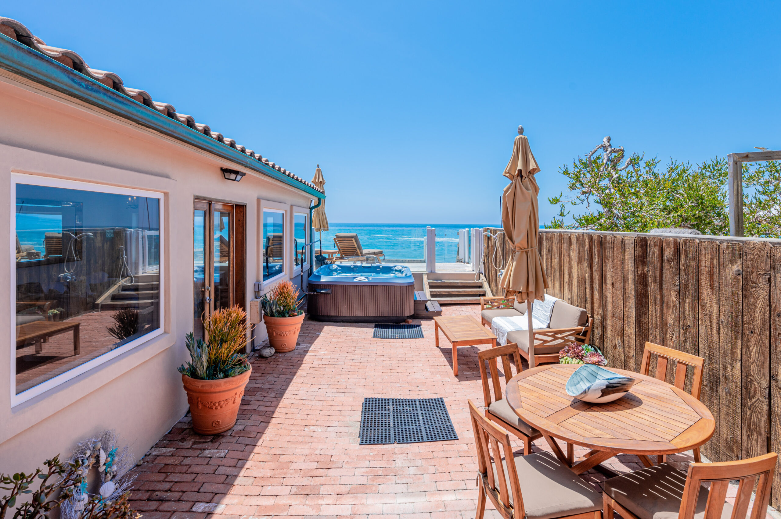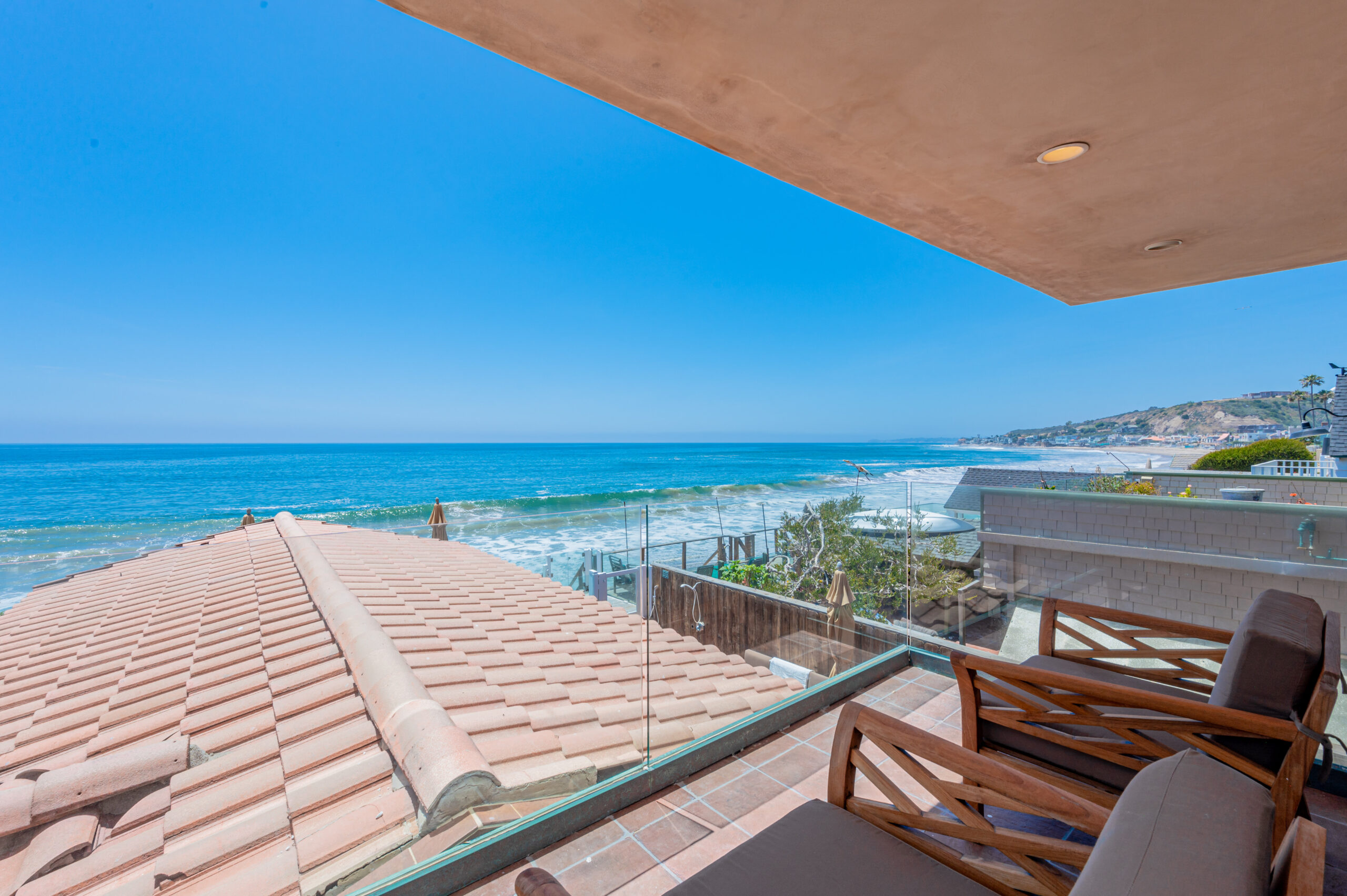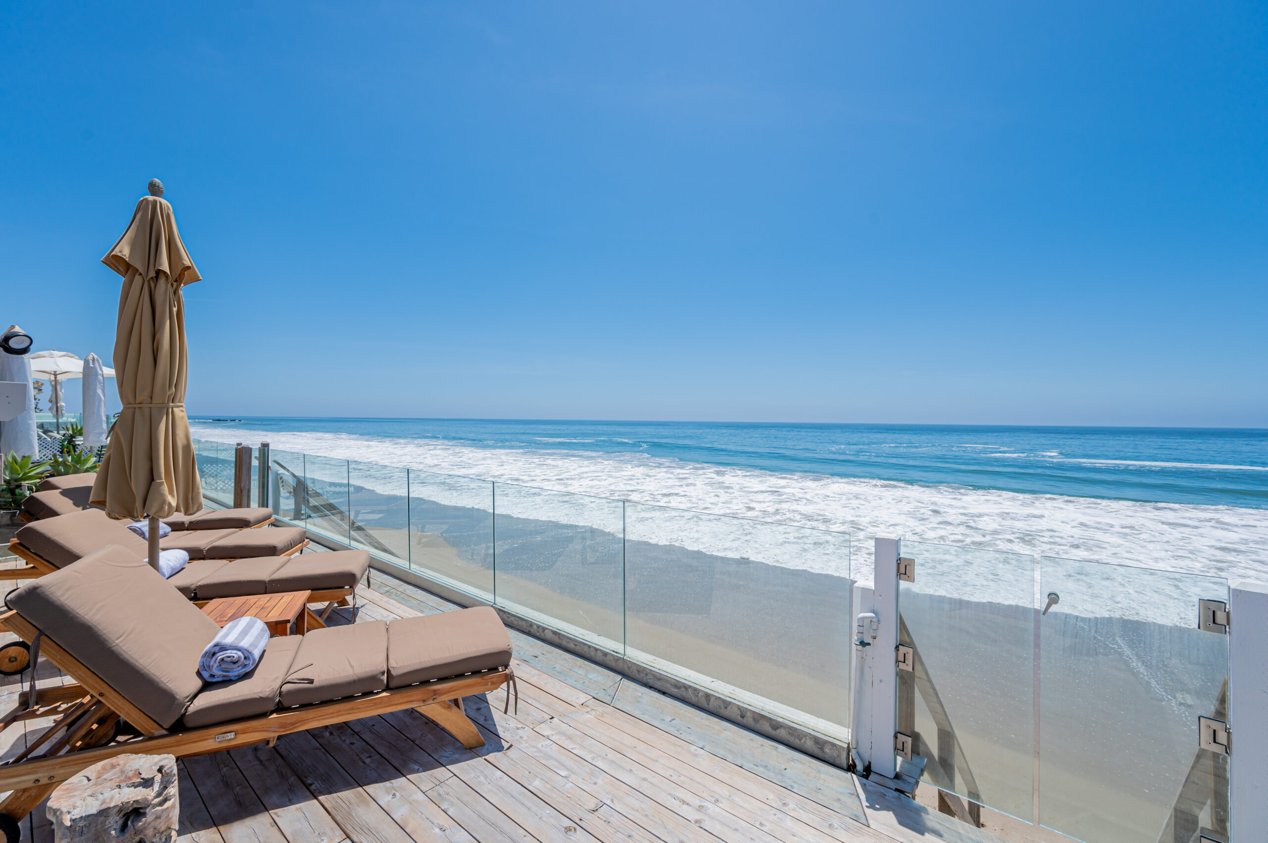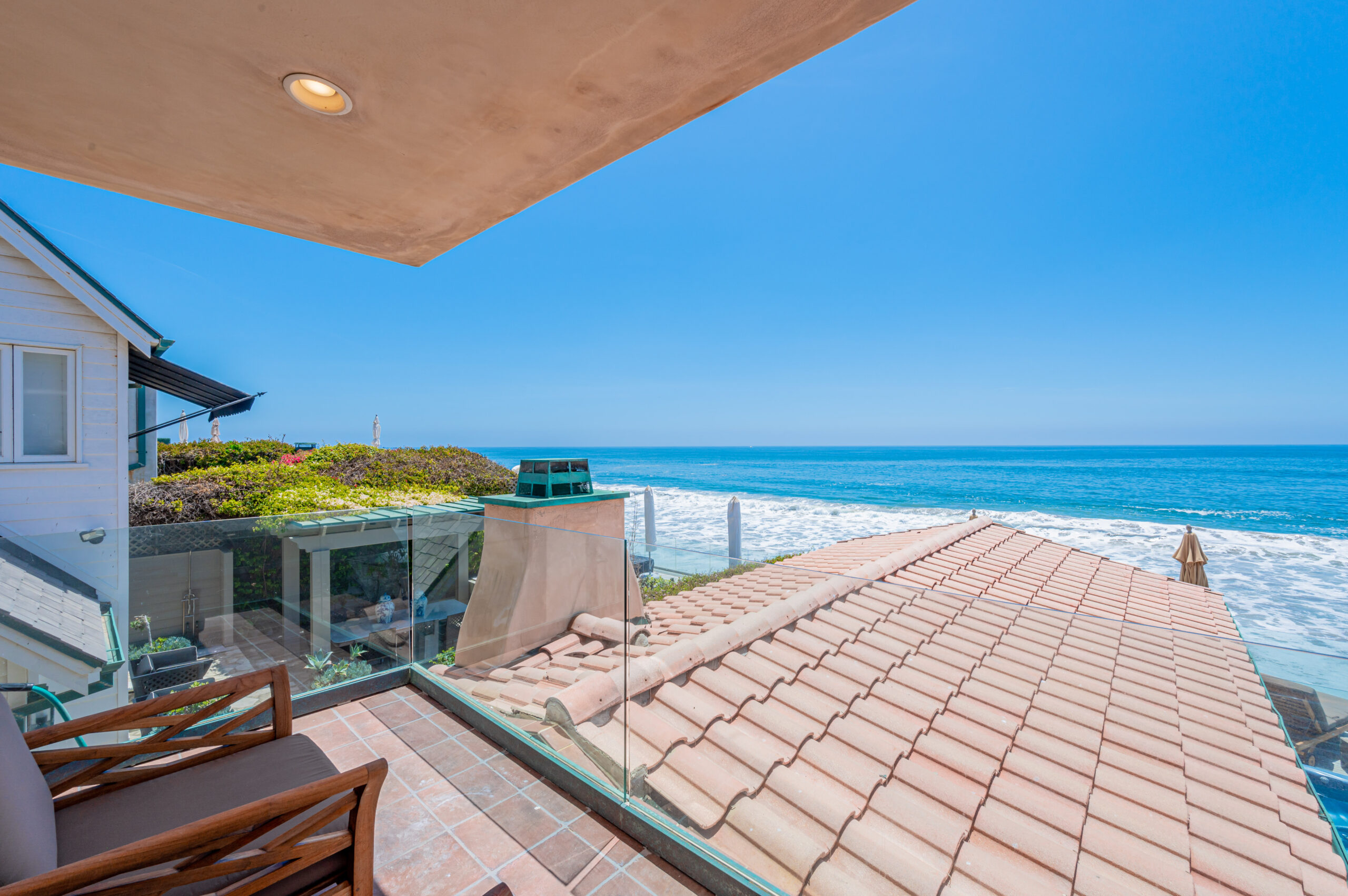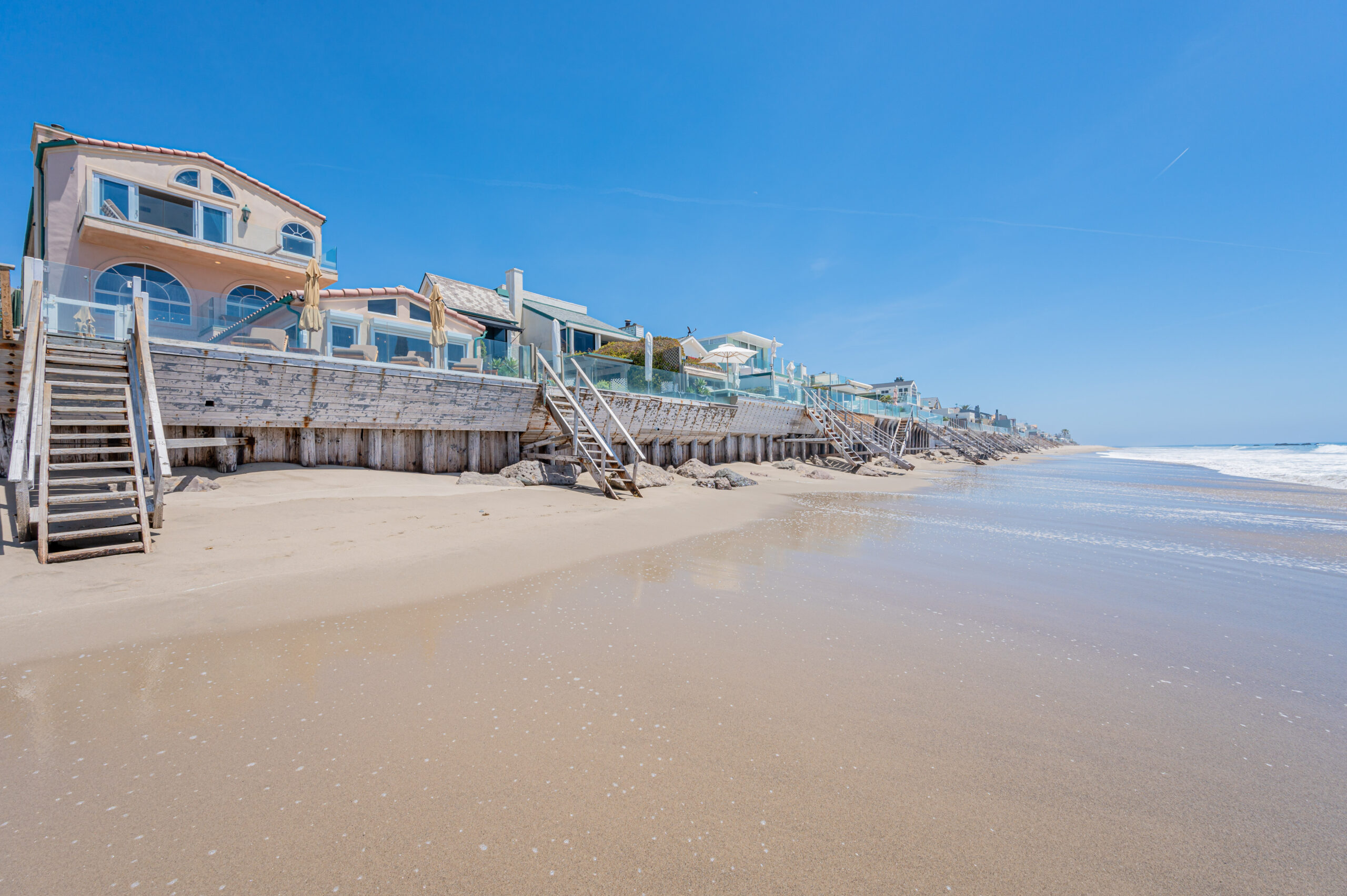Inside the gates of the Malibu Colony, Contemporary Mediterranean ocean front paradise. This elegant and inviting home boast high ceilings, a gourmet kitchen and an open floor plan. The living room and magical tea room lead out to a large beach front patio with ocean view spa and outside dining area perfect for entertaining with friends. On the mezzanine level a pool table and bar. Master suite with a private balcony, ocean view spa and steam shower. Huge separate guesthouse with high ceilings, living room, one bedroom and one bath.