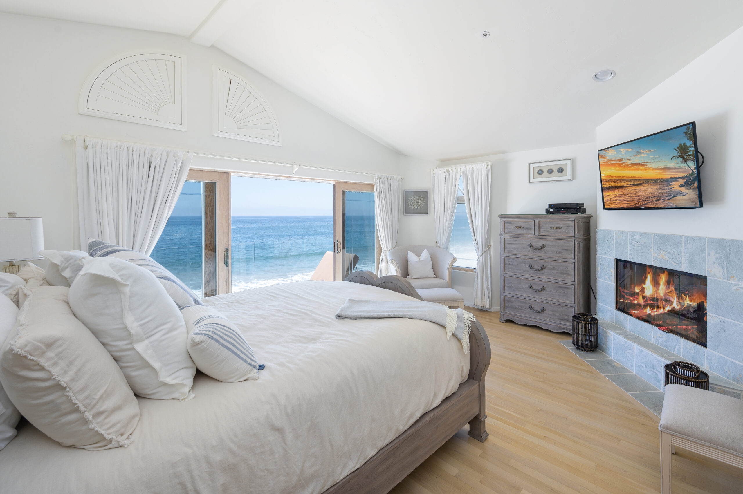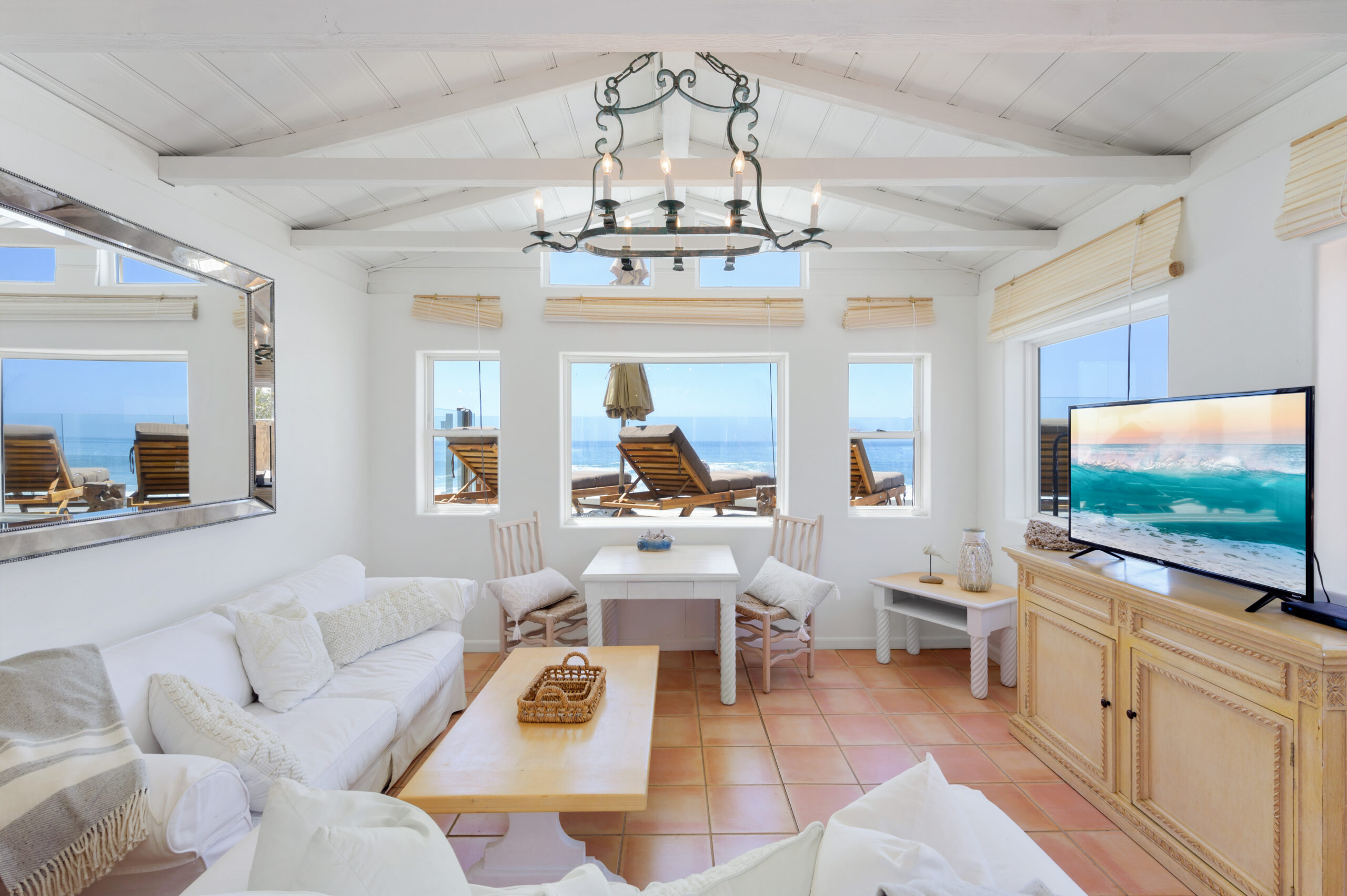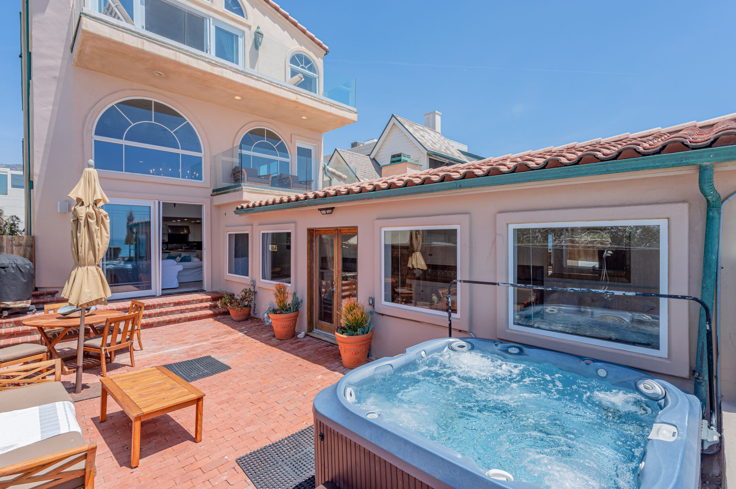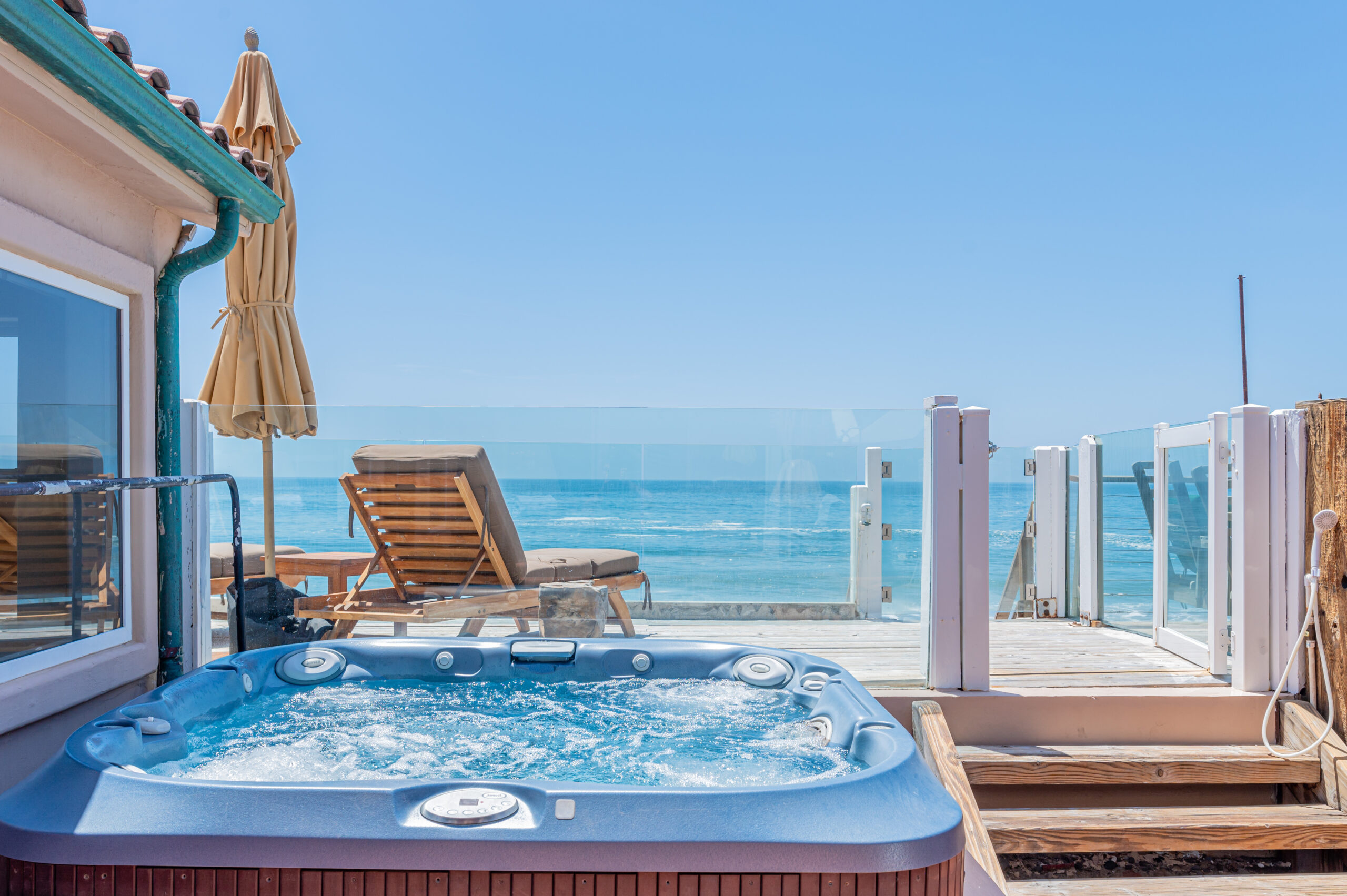 Inside the gates of the Malibu Colony, Contemporary Mediterranean ocean front paradise. This elegant and inviting home boast high ceilings, a gourmet kitchen and an open floor plan. The living room and magical tea room lead out to a large beach front patio with ocean view spa and outside dining area perfect for entertaining with friends. On the mezzanine level a pool table and bar. Master suite with a private balcony, ocean view spa and steam shower. Huge separate guesthouse with high ceilings, living room, one bedroom and one bath.